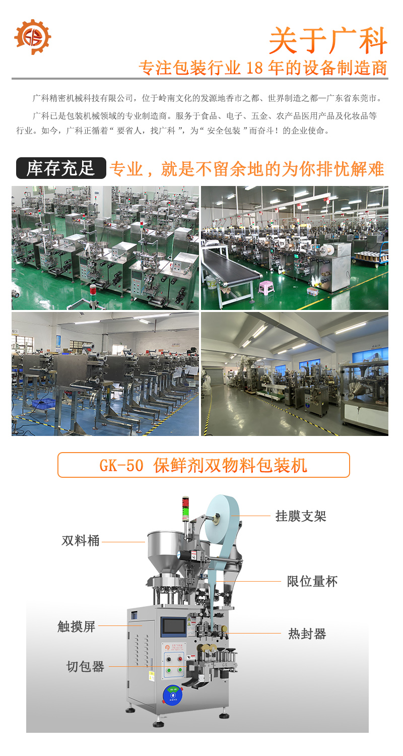 1.彩色觸摸屏和穩(wěn)定可靠的雙軸高精度輸出的PLC控制,制袋、計(jì)量、充填、封合、打碼、切袋一次完成。